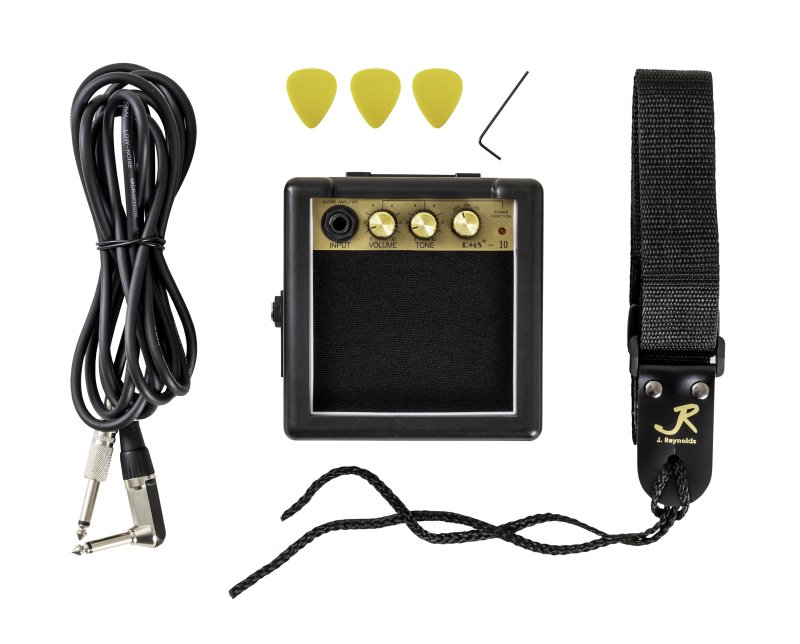 The J Reynolds Mini Electric Single Cutaway Guitar Prelude Pack Jet Black is a "Prelude" to Greatness Pack that includes an RMS Mini Amp, Guitar Strap, Picks, and a 10' Guitar Cable. The 29" Jet Black Guitar features Single Cutaway Body Style, 21 Frets, 1 Humbucker Pickup, 1 Volume Control, and 1 Tone Control. |