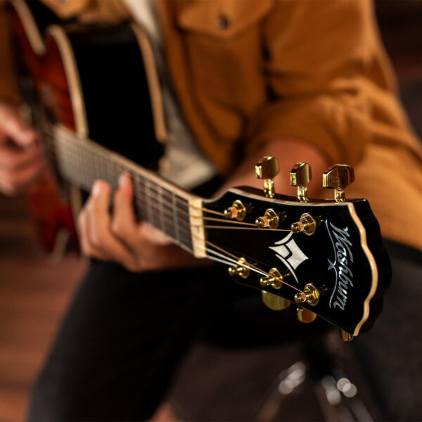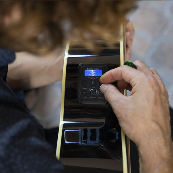 The EA55G-A's under-the-saddle piezo pickup and a 4-band Barcus Berry preamp with built-in tuner gives you the freedom to perform at any venue. Other features on this Washburn guitar include chrome die-cast Grover style tuning machines, white body and neck binding, an abalone-style rosette and a buffed gloss finish.