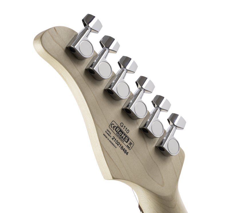 The G110 features a double cutaway body for classic styling, comfort, and easy access to the higher register of the fretboard. This popular pickup configuration with the 5-way switch provides a wide variety of sounds to cover virtually any musical style. With the middle and neck pickups alone or in combination, the sounds are not only ideal for rhythm playing but for distinctive single- coil lead sounds, while the powerful humbucker pickup in the rear provides fat and heavy tones that are perfect for power riffing or blistering leads. Conceived with the younger beginners in mind, the thinner body reduces the weight for a nice balance between the body and the neck as well as enhancing playability and reducing fatigue. Unlike the square-cut heel of traditional bolt-on guitars, the heel on the G-Series guitars are beveled round for easier and smoother access to the frets in the high register of the fingerboard. A clean look as well as no drag on your fingers due to the smooth satin finish means more comfort, increased speed and enhanced playability. Besides improving the resonance of the woods for a livelier sound, the open pore finish better retains the natural grains of the woods for a more luxurious look and feel.