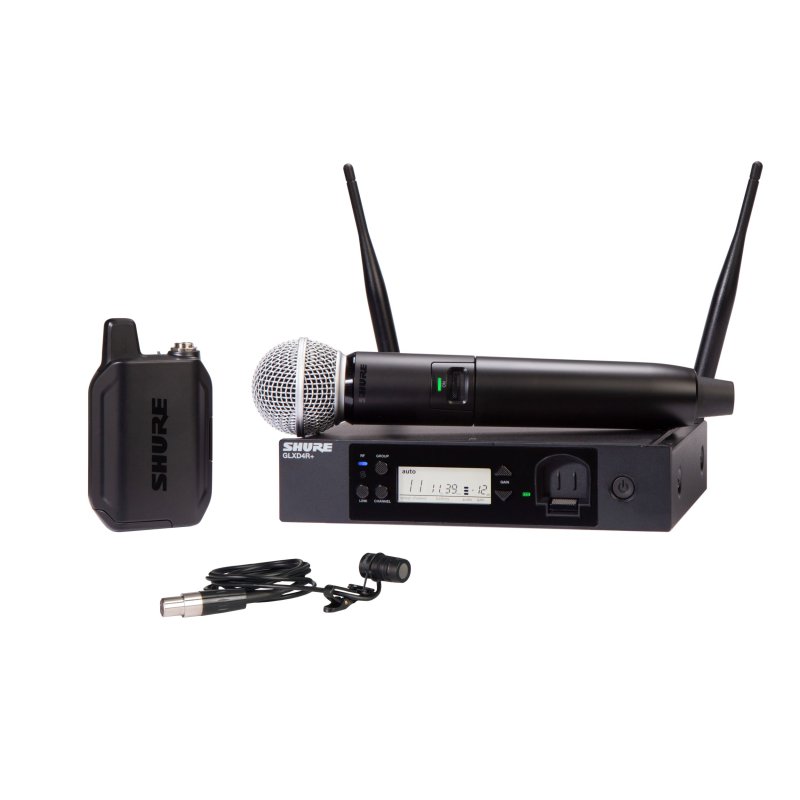Combo System with SM58 microphone handheld, WL185 lavalier microphone, and half-rack GLXD4R+ receiver.