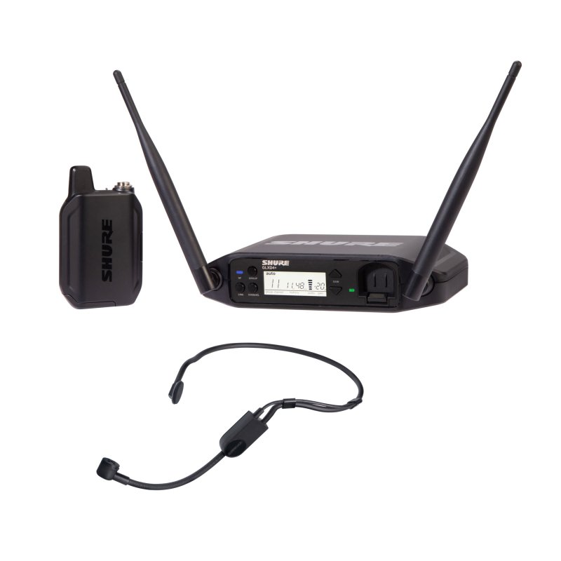 The GLX-D+ Dual Band Wireless Headset System features the PGA31 Headset Microphone for spoken word applications and the GLXD4+ tabletop receiver.Â