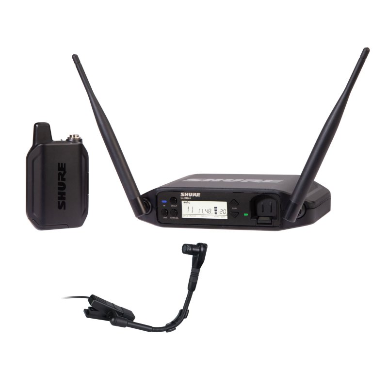 The GLX-D+ Dual Band Wireless Presenter System features the precision-crafted BETA 98H/C flexible gooseneck microphone for brass, woodwind and percussion applications and the GLXD4+ tabletop receiver.