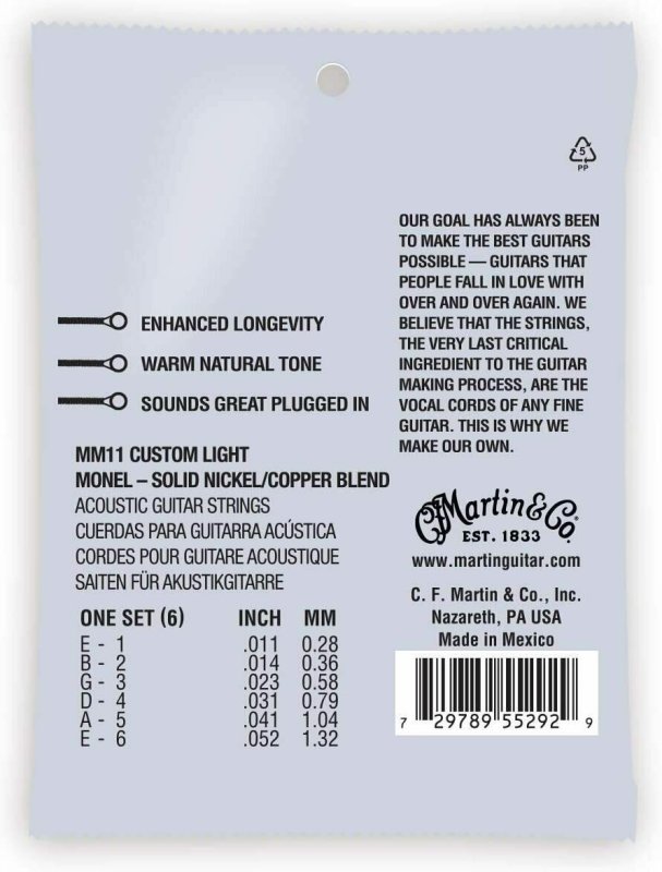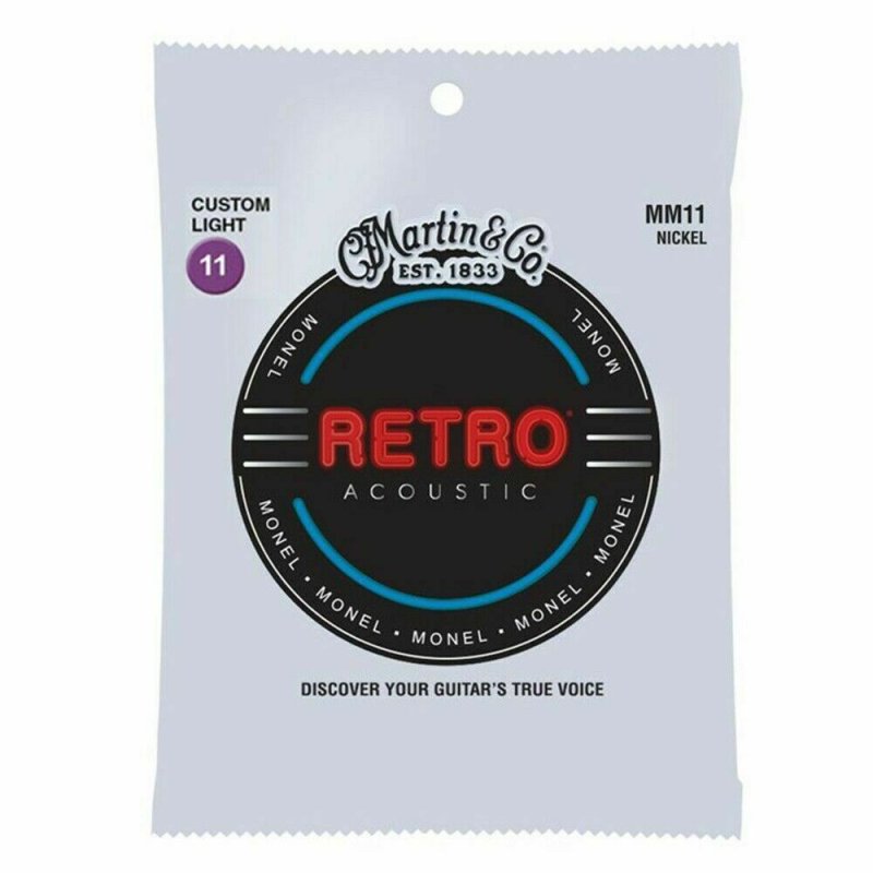 Martin Retro strings are the real deal. Not an imitation. With Martin Retro strings, you get one tough set that offers true, consistent tone and sounds like nothing else on the market. Martin's solid Nickel/copper alloy blend provides a reduced pick attack that allows the guitar's tonewoods to be heard, not overshadowed. Martin's proprietary Monel wrap wire is naturally corrosion resistant, so you can play them for a long time with nothing to get in the way of your music. Discover your guitar's true voice. Retro strings offer enhanced longevity with warm natural tone, and they sound great plugged in.